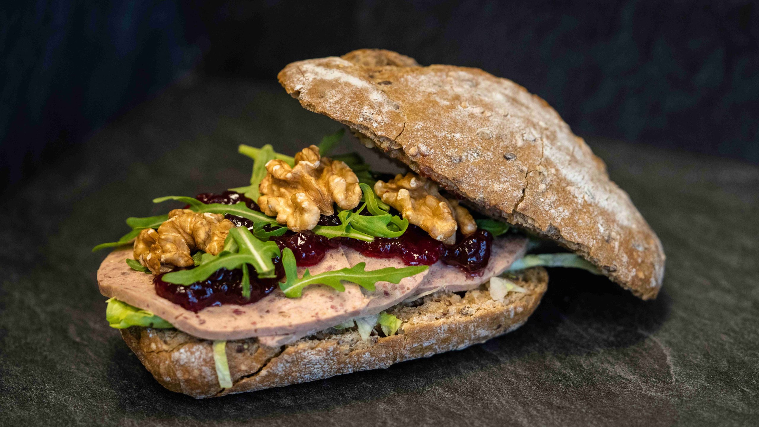 Paté van wilde eend met preiselbeeren compote, walnoten en rucola